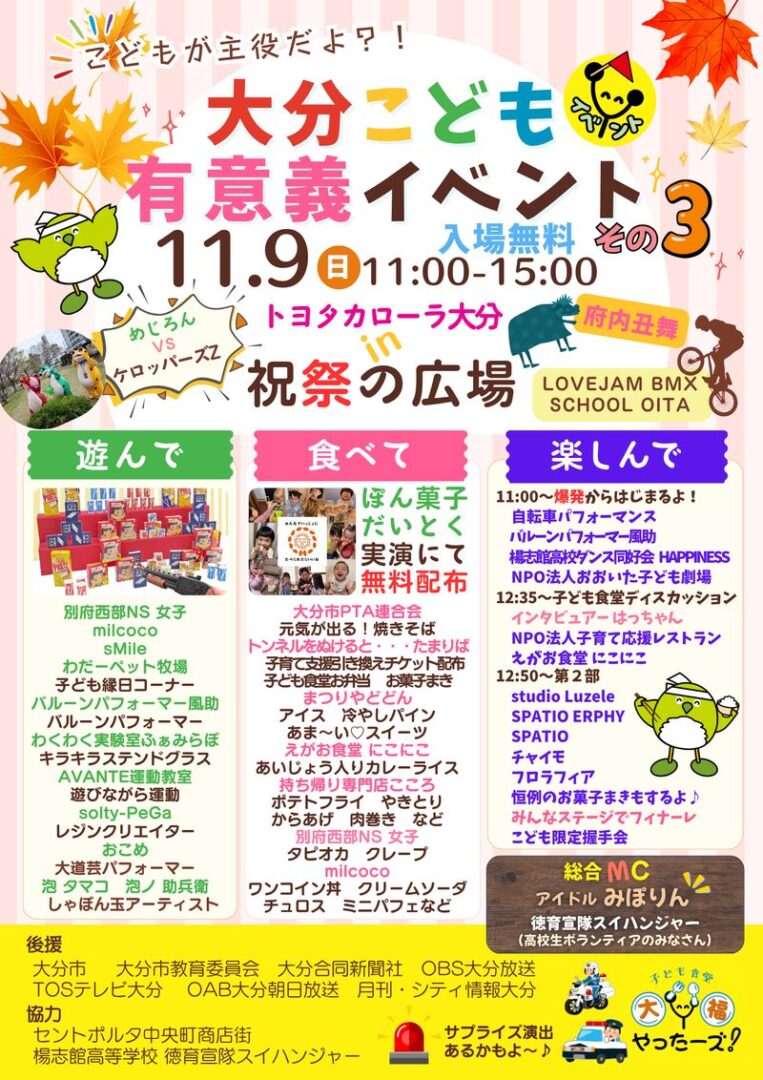 「大分こども有意義イベントその3」がトヨタカローラ祝祭の広場にて開催されます。パフォーマンスや子ども縁日、ごはんやスイーツの販売、お菓子まきやライブなどなど・・・。