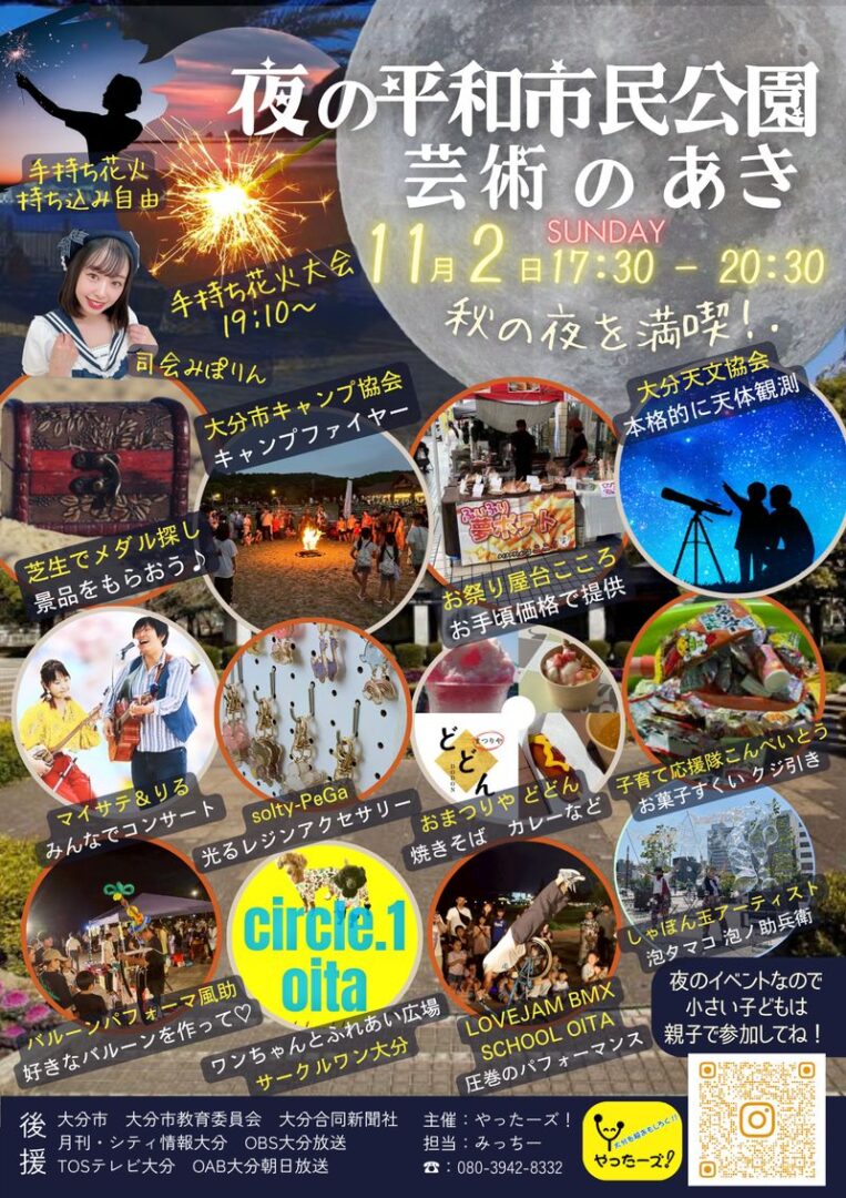 平和市民公園で入場無料の夜イベント開催!キャンプファイヤーや本格的な天文観測、焼きマシュマロ、花火大会、バルーン・自転車・しゃぼん玉パフォーマンスなど、楽しめる内容が盛りだくさん。屋台や音楽ライブ、ワンちゃん交流会もあり!POART登録アーティストも計5組参加します。3連休の夜を公園で秋を満喫しましょう。