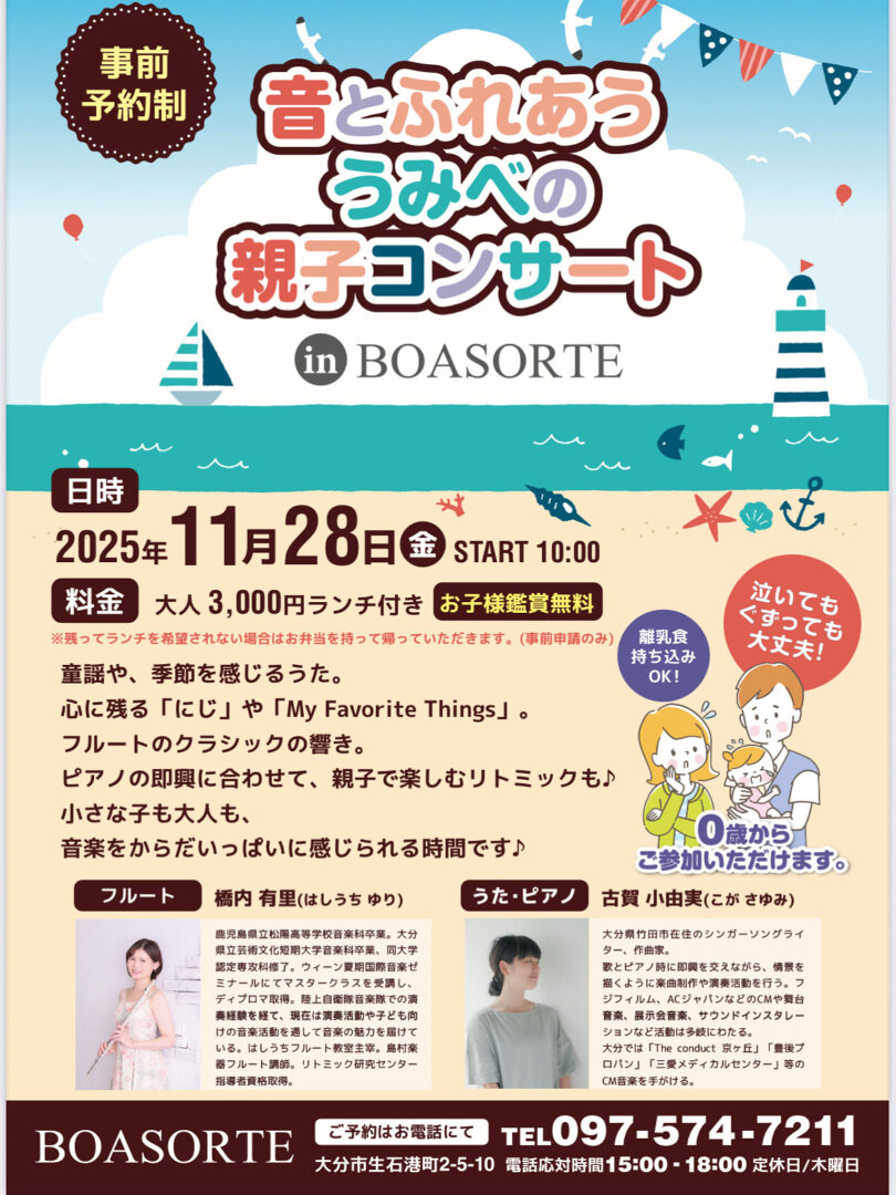 0歳のお子さんからご入場いただけるコンサート。泣いてもぐずっても大丈夫。離乳食の持ち込みも可能。童謡や季節のうた、フルートによるクラシックの響き、ピアノの即興に合わせたリトミックなど、親子で生演奏を全身で楽しめる、アットホームで和やかな時間をお届けします。フルートはPOART登録アーティストの橋内有里、うた・ピアノは古賀小由美。事前予約制。 ご予約はBOASORTE (097-574-7211)へお電話にて。