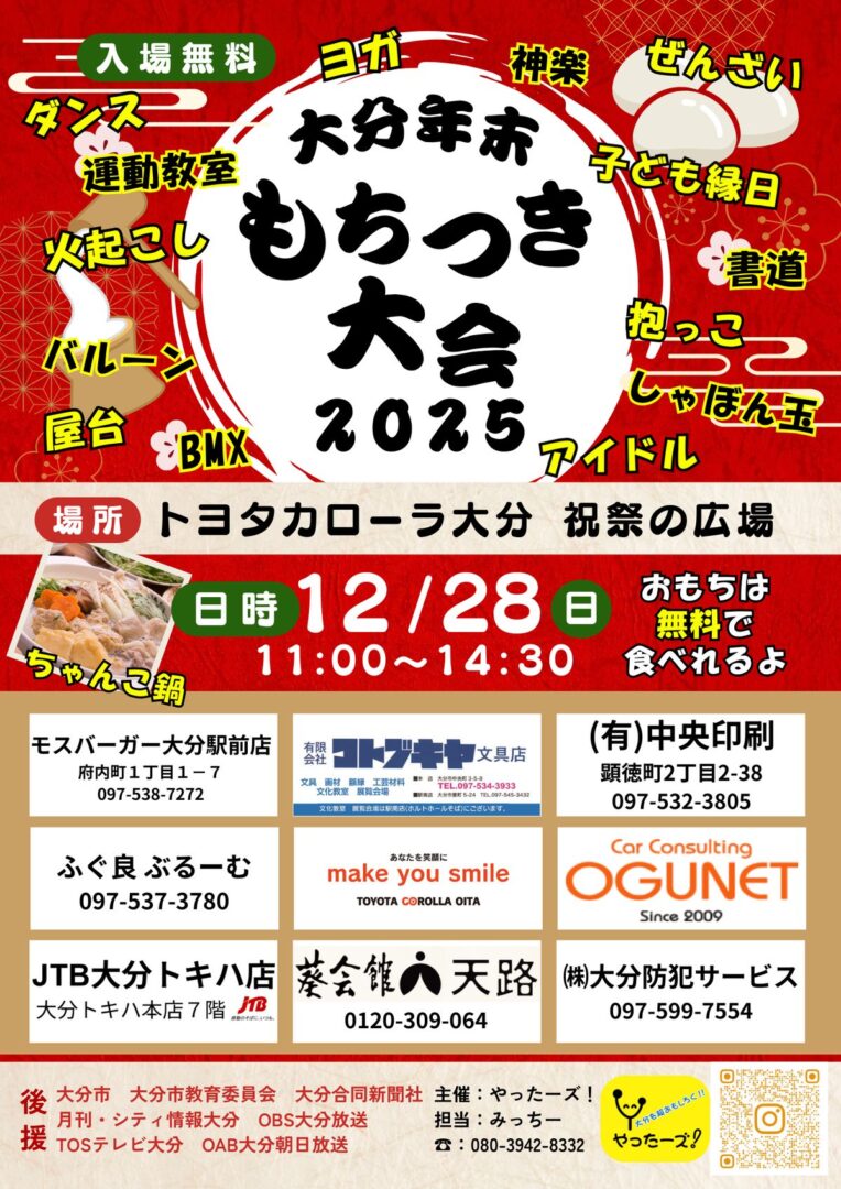POART登録スポット『トヨタカローラ大分 祝祭の広場』で行われるもちつきイベント。ついた餅は無料で食べられるほか、イベントも満載。神楽、ヨガ、こどもダンス、アイドルとステージも充実。子ども縁日、運動教室や屋台もあり、「楊志館高校相撲部」の本格ちゃんこ鍋もあります。POART登録アーティストは泡ノ助兵衛、泡タマコ、バルーンパフォーマー風助、Floraphia、みほ、BMXパフォーマーあおみが出演。ぜひご来場ください。