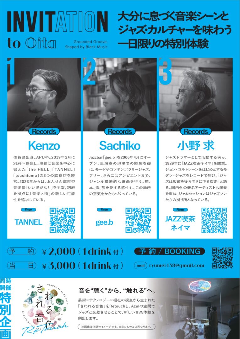 大分で静かに息づいてきた音楽やカルチャーに、気軽に触れられる入口をつくりたい――そんな思いから生まれたイベント。ジャズやビートなど、多彩な表現の現場には、まだ広く知られていない魅力やコミュニティがある。今回の企画を手がけるのは、POART登録アーティスト・枝次竜明。場所は『Azul』。RecordsはKenzo(TANNEL)、Sachiko(gee.b)、小野求(JAZZ喫茶ネイマ」)の3人。サウンドインスタレーション《SOUND INSTALLATION さわれる音色ReTouch》では、「音を“聴く”ものから、“触れて感じる”ものへ」という発想の転換に挑む。特別な知識や経験は必要ない。ふらりと立ち寄り、音に耳を澄まし、その場の空気を感じる――それだけで十分に意味がある。
