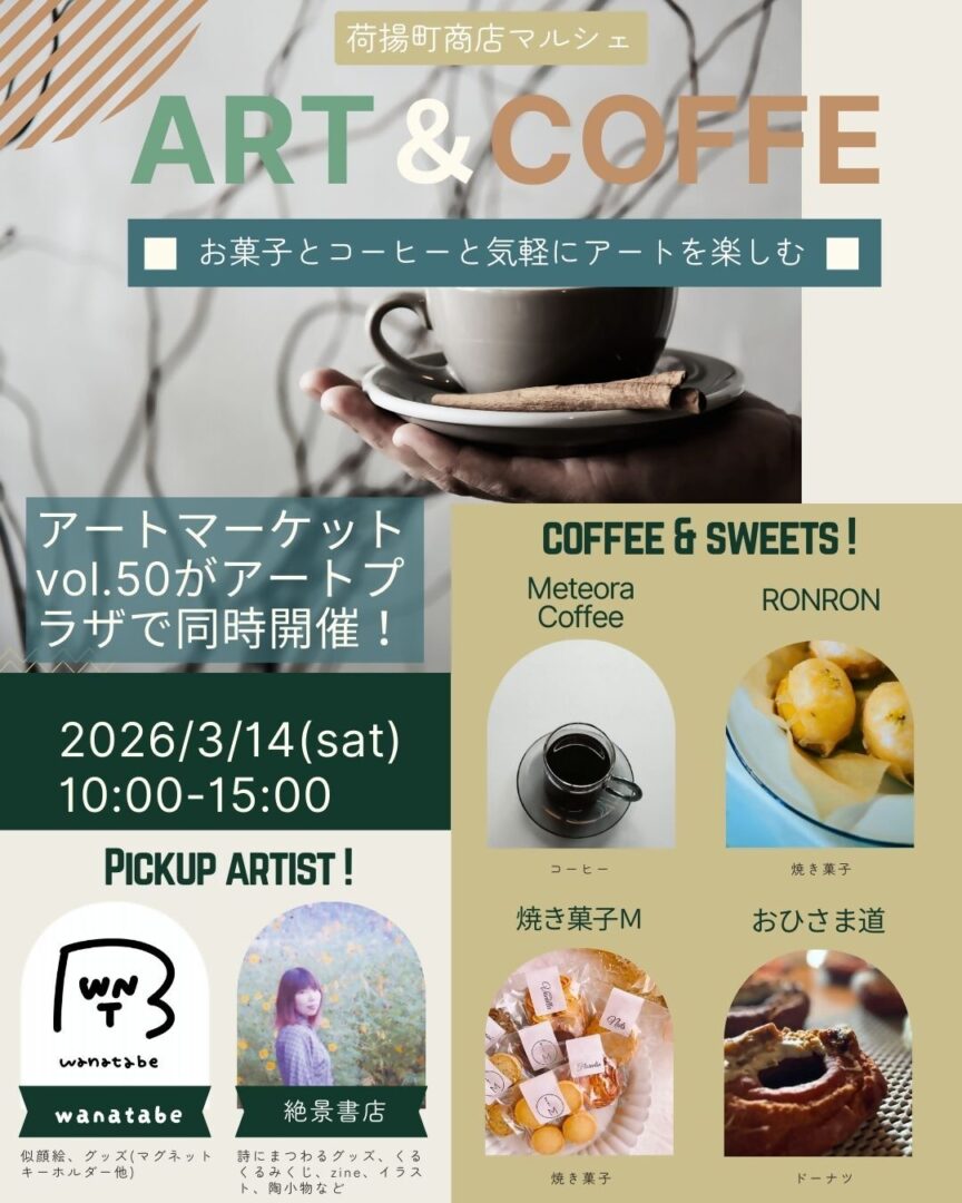 荷揚リンクスクエア1F・荷揚町商店では、マルシェ【 ART & COFFEE 】を開催いたします。コーヒーや焼き菓子とともに、気軽にアートを楽しんでいただける空間をご用意します。両会場を行き来しながらお楽しみください。