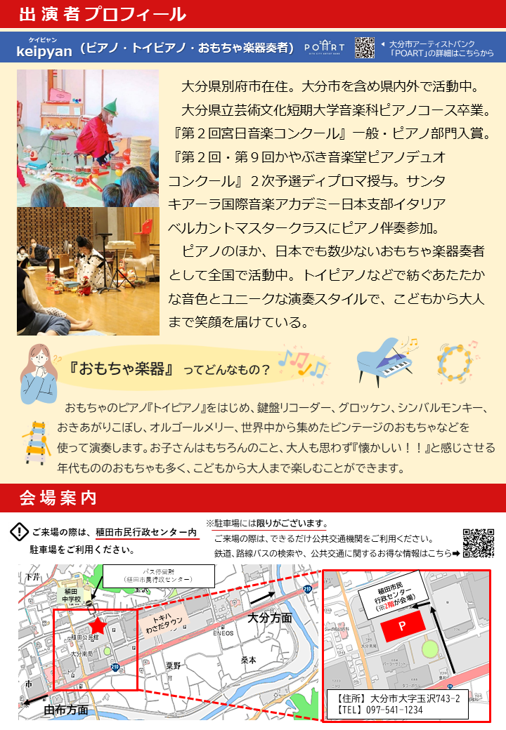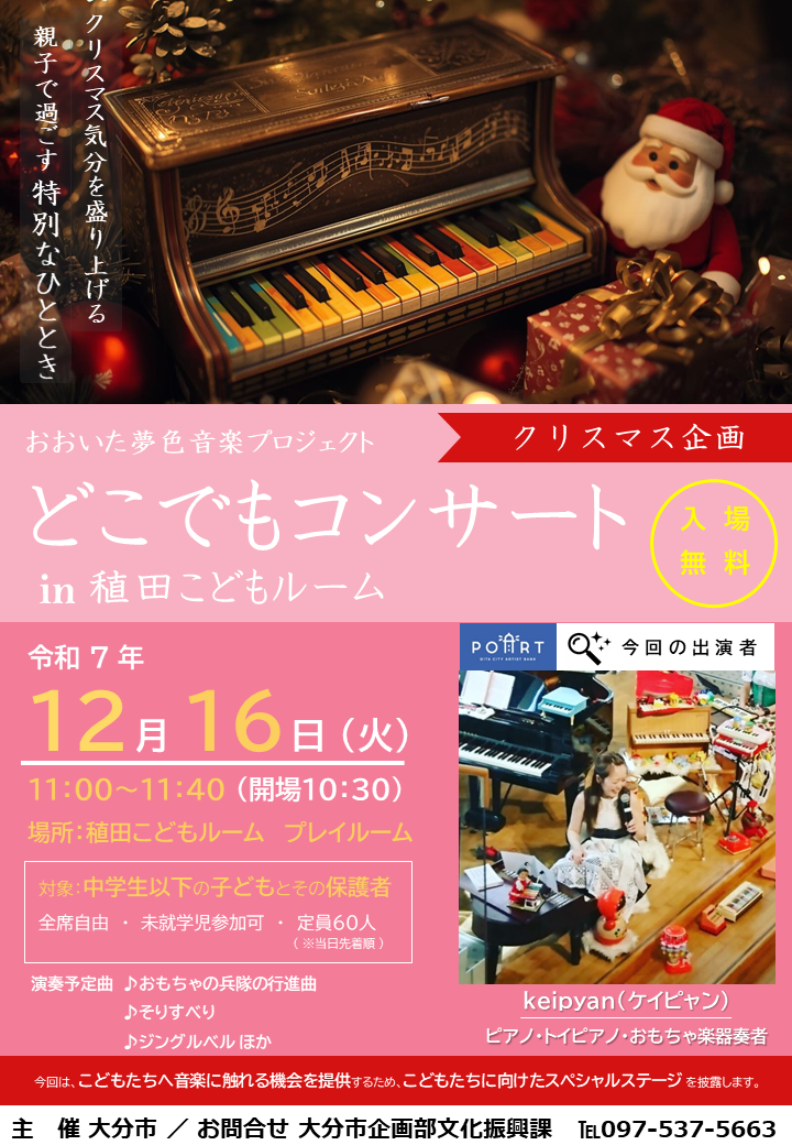 気軽に音楽に親しむ機会として、市内各地で開催している大分市主催「どこでもコンサート」。今回は稙田こどもルームで行います!